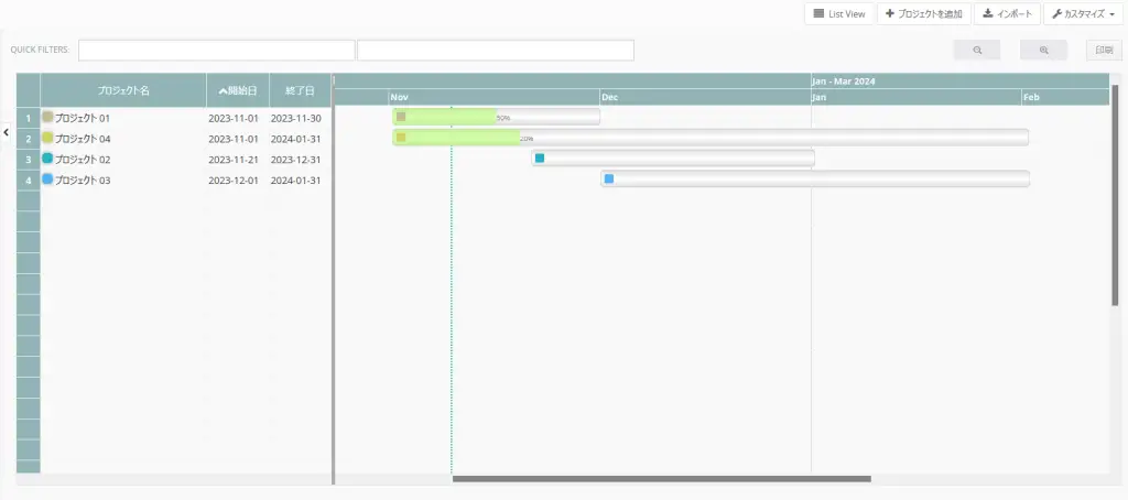 リストと連動しているため、様々な切り口(分類単位、期日単位、担当者単位など)で、プロジェクトを可視化できます。プロジェクト間の重なりや進捗状況も表示されるため、プロジェクトの進捗状況、プロジェクト遂行のためのリソースに問題ないかなどを把握することが可能になります。
