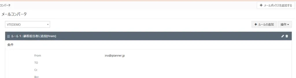 標準のVtigerCRMでは、設定できるメールボックスが1個になっています。その結果、会社宛(info@~)のメールをメールコンバータに設定すると、営業部のsales@~宛のメール処理、顧客サポート部のsapport@~宛のメール処理には利用できません。