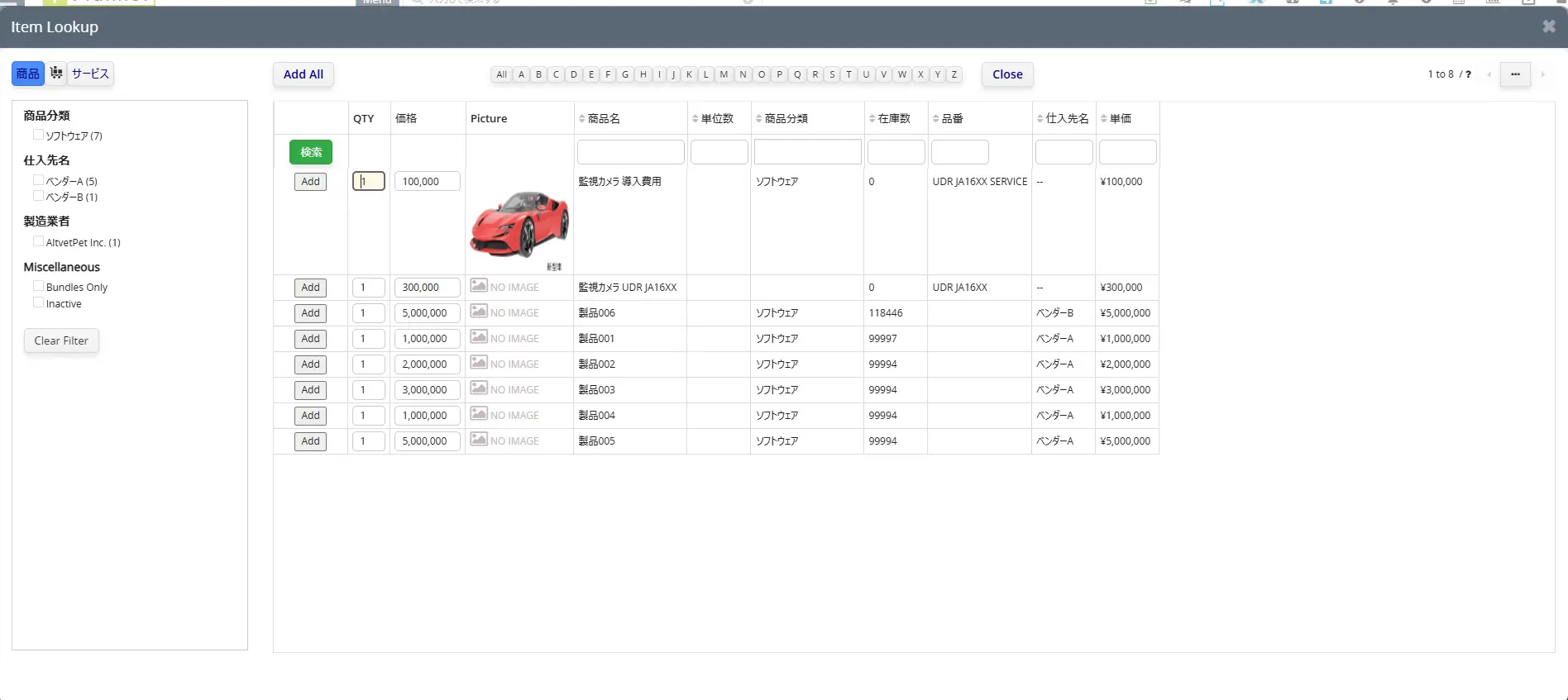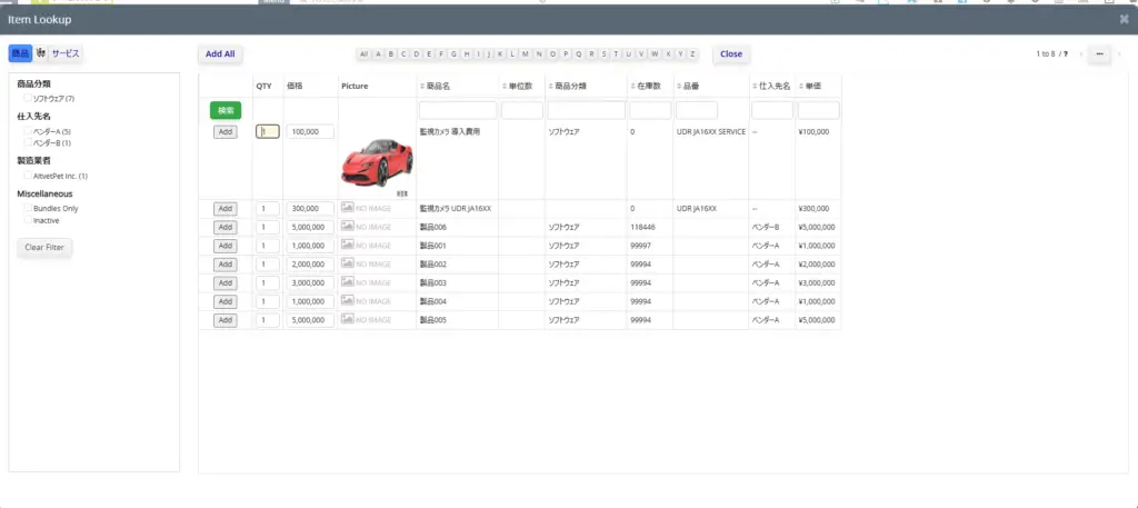 数千点の商品があっても迷いません。サイドバーのフィルターを使えば、「カテゴリ」「ベンダー(仕入先)」「メーカー」などの条件で即座に絞り込めます。