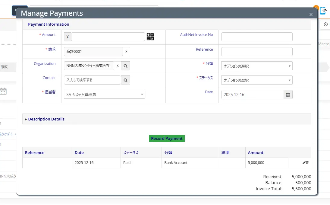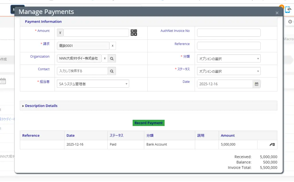 標準のVTigerでは「支払済み」か「未払い」の二択しかありません。
