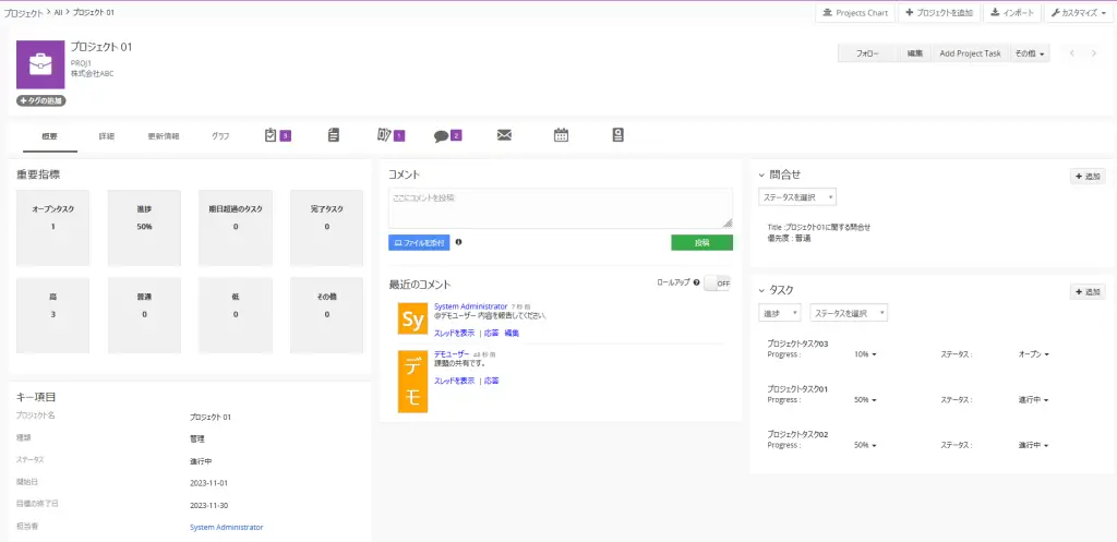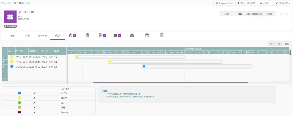 例えば、顧客向けには納品業務、社内向けには業務改善プロジェクトなど、複数メンバーが共同しながら作業を行う場合に効果的に利用することができます。プロジェクトの進捗状況、発生している課題の共有、関連するプロジェクトタスクの進捗管理などを行うことができます。